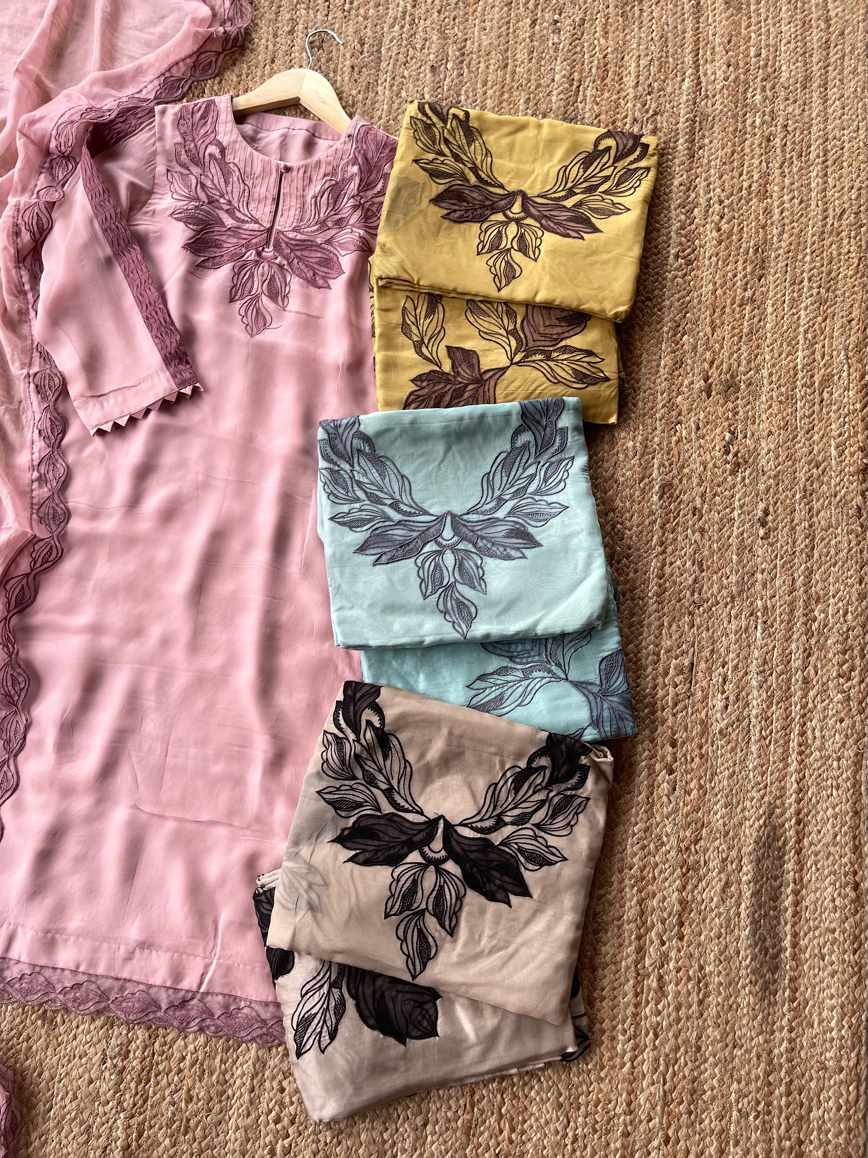 Step into luxury and grace with our Georgette Tissue outfit, a timeless three-piece set designed to make every occasion special. This ensemble beautifully blends rich fabrics, elegant drape, and modern sophistication to bring you the perfect ethnic wear staple.