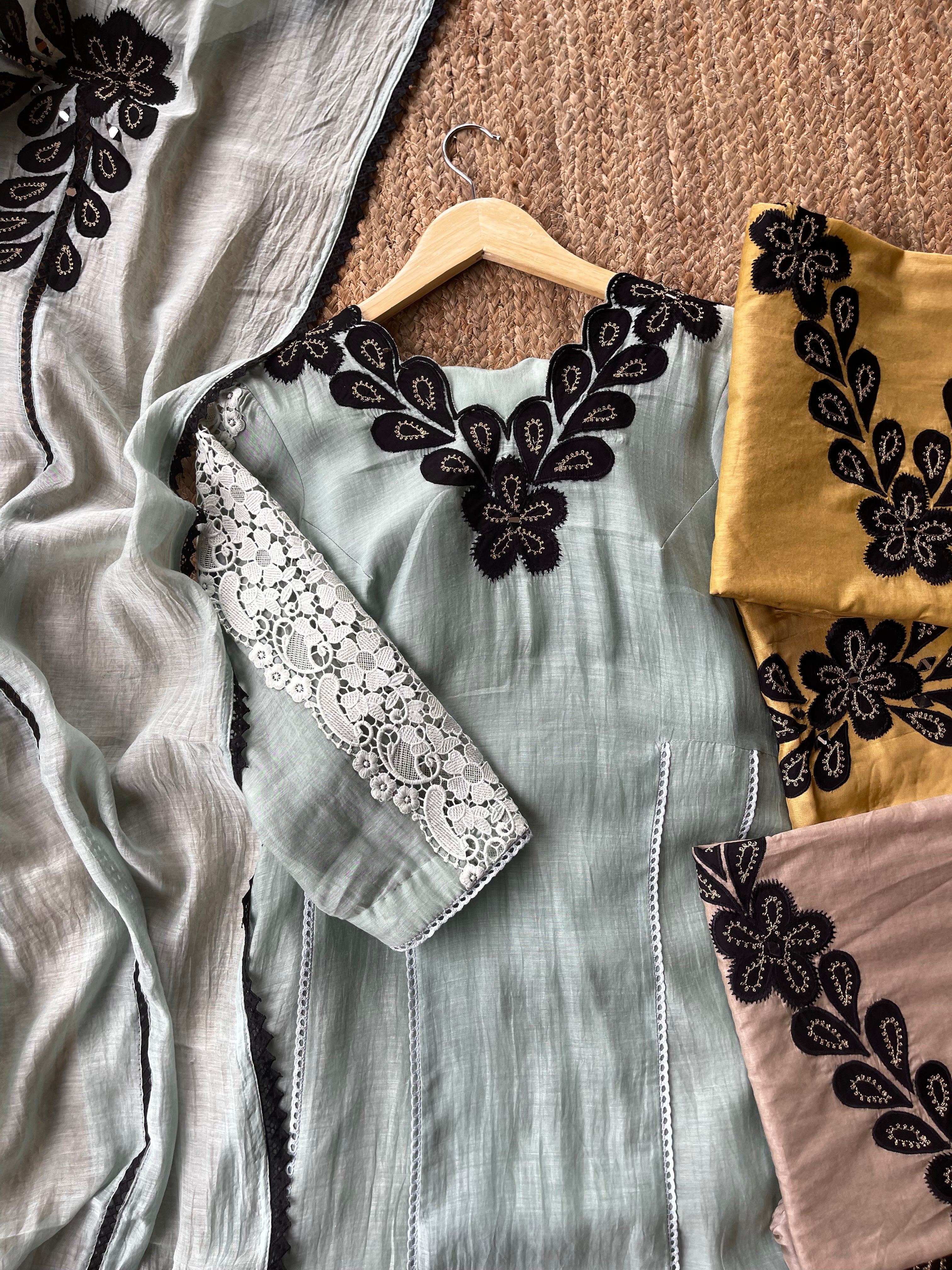 The shirt and dupatta are made from Pure Mul Cotton, a fabric loved for its soft, airy texture and natural flow. Light on the skin yet rich in appearance, Mul Cotton ensures all-day comfort while maintaining a refined and graceful look. The fabric’s breathable quality makes it perfect for warm weather, giving you a breezy and elegant drape.
