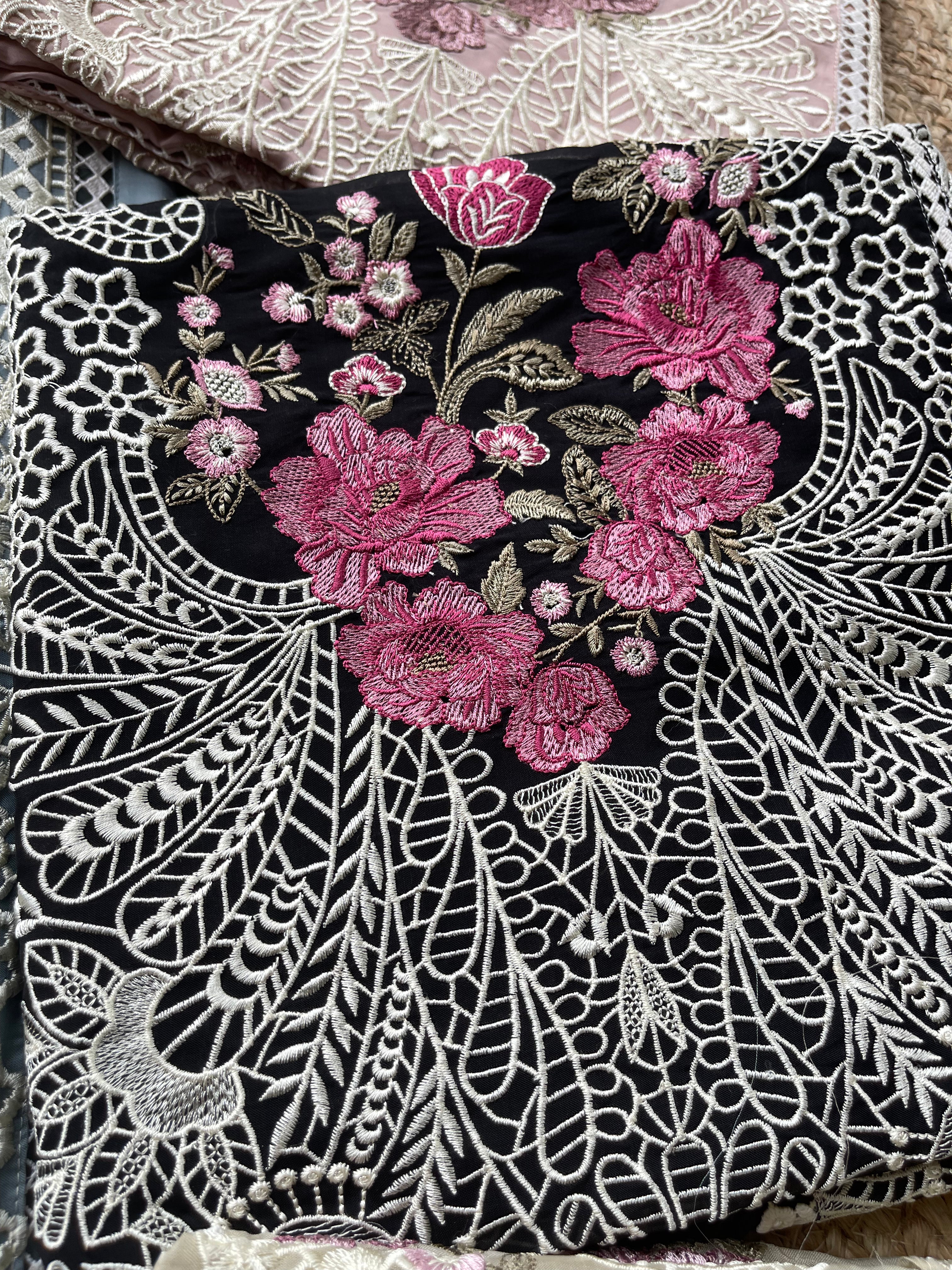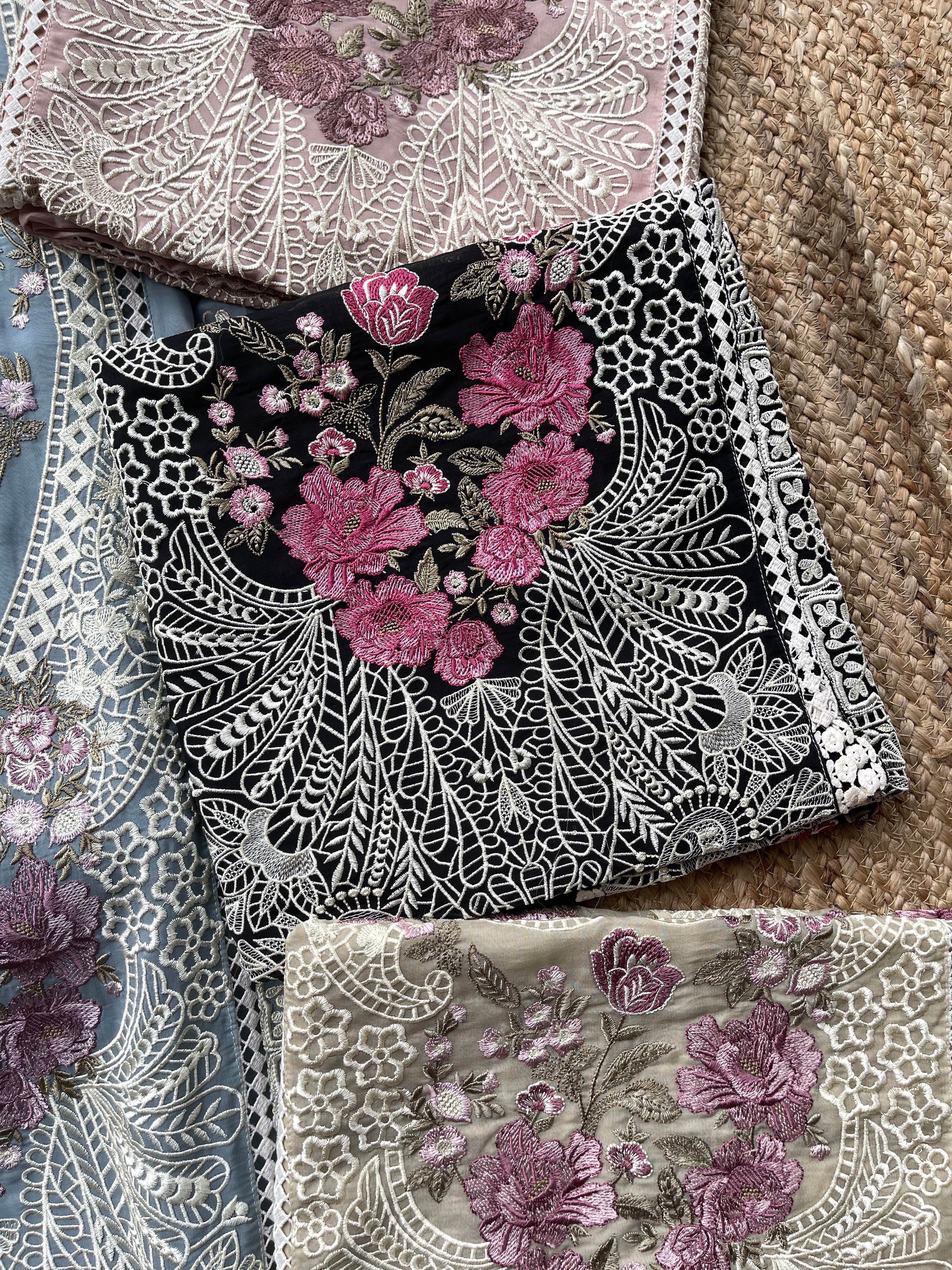 Bring elegance to your wardrobe with this graceful Pakistani Collection unstitched three-piece outfit, designed for timeless charm and modern sophistication. The shirt and dupatta are crafted from premium Georgette Tissue, known for its soft texture, lightweight feel, and subtle shine that drapes beautifully. Complementing this is a Cotton Silk bottom, offering all-day comfort with a refined, polished finish.