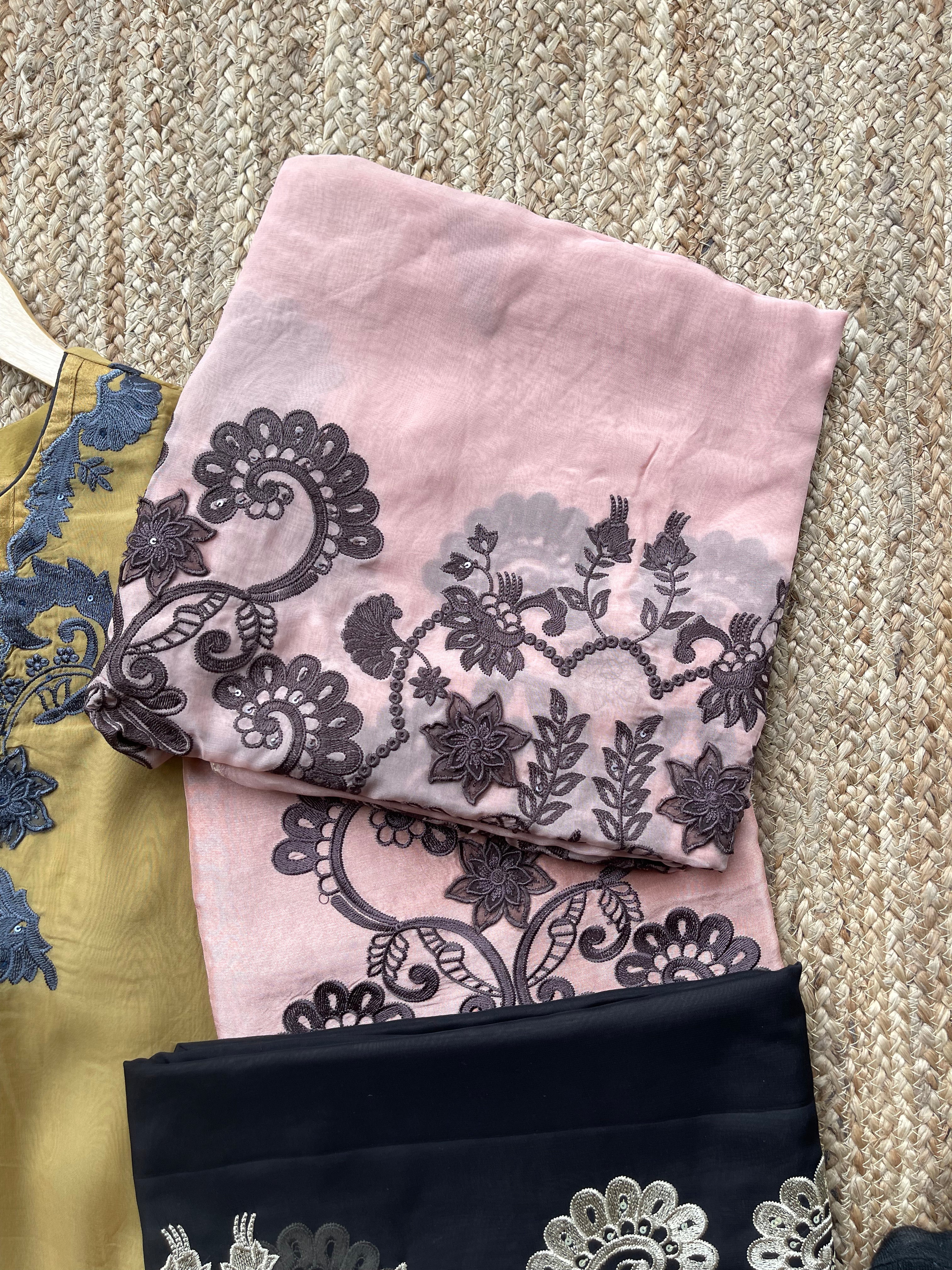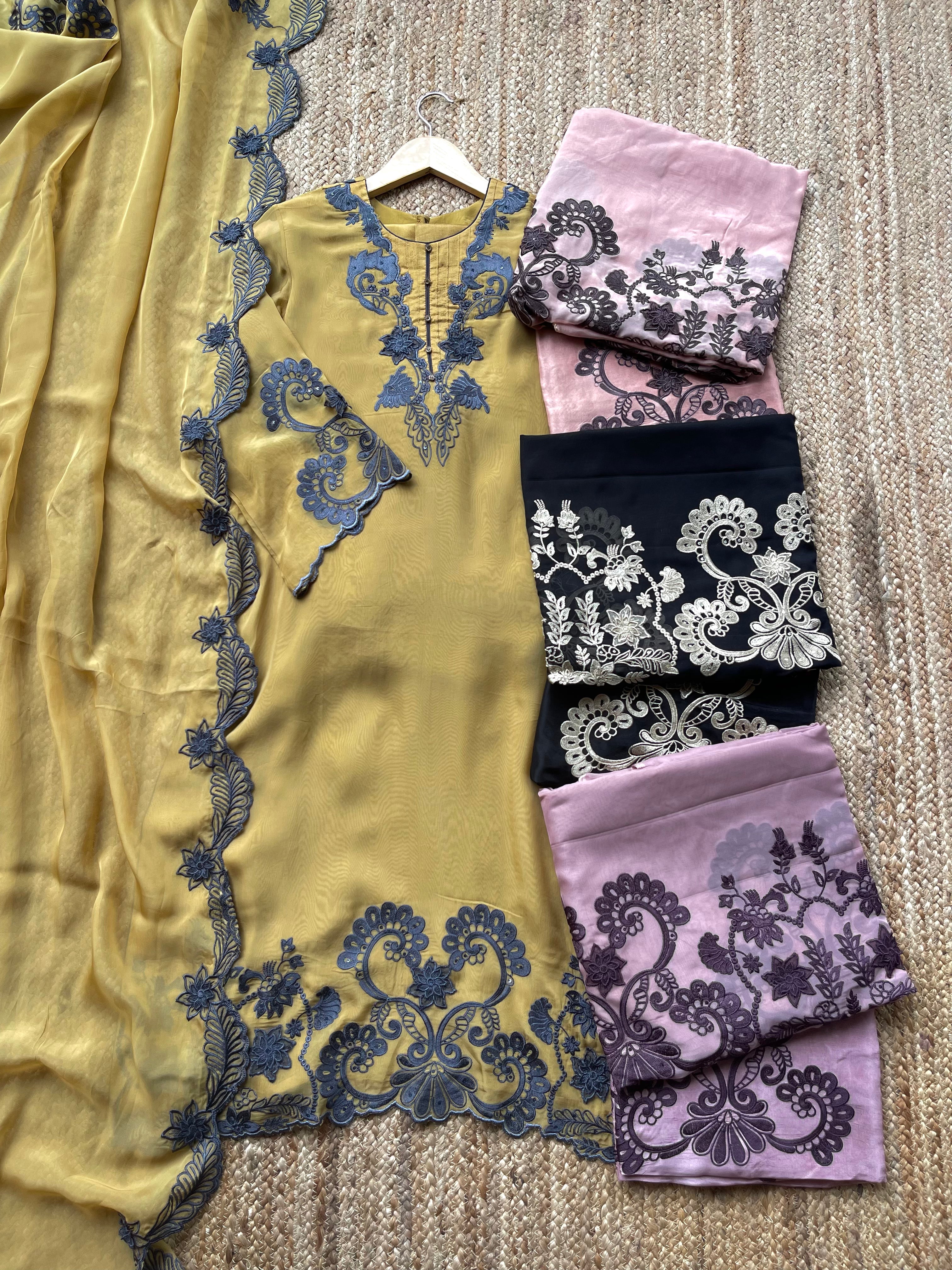 Step into luxury and grace with our Georgette Tissue outfit, a timeless three-piece set designed to make every occasion special. This ensemble beautifully blends rich fabrics, elegant drape, and modern sophistication to bring you the perfect ethnic wear staple.